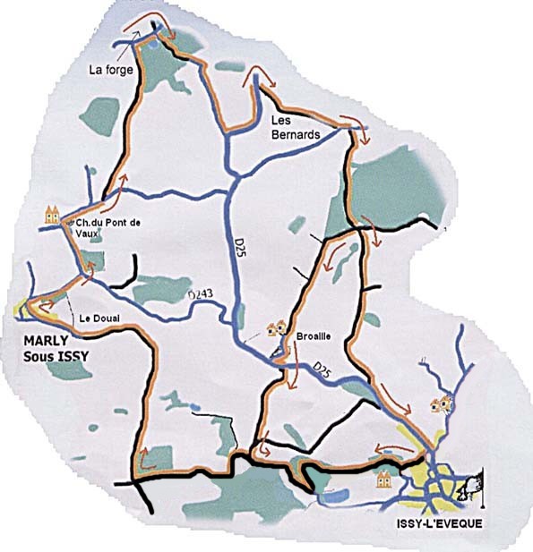 Au CHATEAU du pont de VAUX (TOUR du 18° siècle) Direction la FORGE Site remarquable, ancienne forge : transformation de la fonte en acier. Utilisation de la force motrice de la rivière: LA SOMME étang barrage de 1766 à 1848. Vous arrivez sur la D25, remontez sur 400 mètres, puis prendre à droite le chemin et ensuite ferme les «BERNARDS» passage de la rivière, remontez la forêt. Deux chemins pour ISSY-L'EVEQUE : PR N°1 Broaille et Camping ou PR n°1 ISSY-L'EVEQUE.